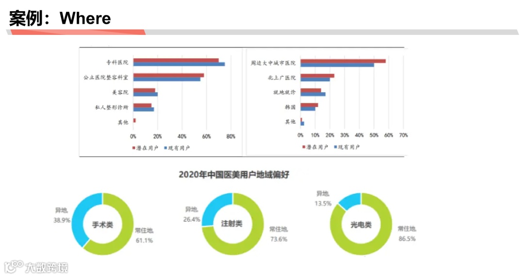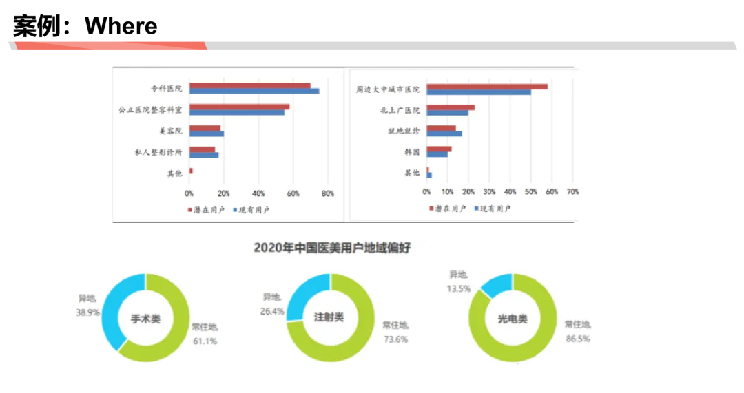 Where:用户去哪满足需求,专科医院还是美容院……比例如何?选择不同项目的用户又倾向去哪里进行消费?