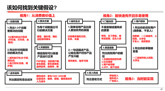我借用在行业分析里面讲到的商业模式画布的技巧,可以从三个角度来去找到关键假设,确定完关键假设再用需求分析与消费者调研的方式或者是进行调研方式去验证。三个角度为:从消费者价值上、从能够快速传播并且能够使用上、从当时能够实现上。(见下图)