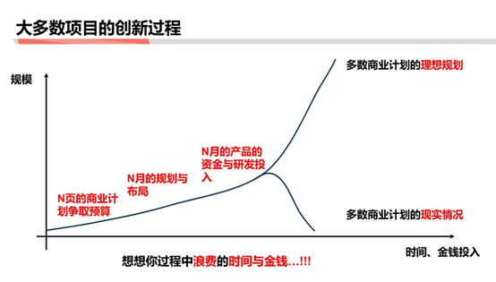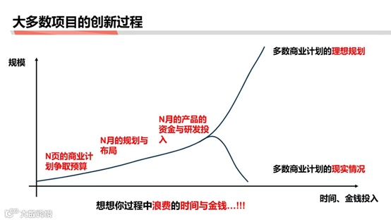 理想规划:先想办法去调研、写计划书、申请预算。最后假设产品做出来之后,它一定能够规模上涨,但这时候,时间和金钱投入会很高。