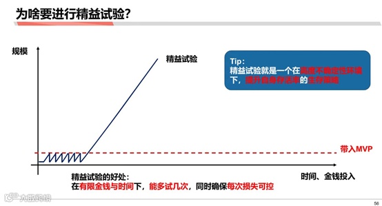 MVP大概是这样的策略,MVP在这里的应用也大概是这个样子。它的好处是你在有限的金钱和时间之下,你能够多试几次,同时又能够确保每次的损失是可控的 。所以说为什么进行精益实验:其实是为了在高度不确定的环境下,提升自身存活率的生存策略。