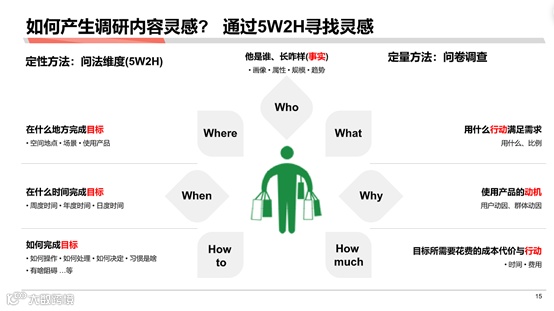 其实可以通过之前系列文章提到的5W2H的方法来去找灵感。那我现在给大家详细介绍一下5W2H这七个维度分别“在用户消费者调研”中的应用。