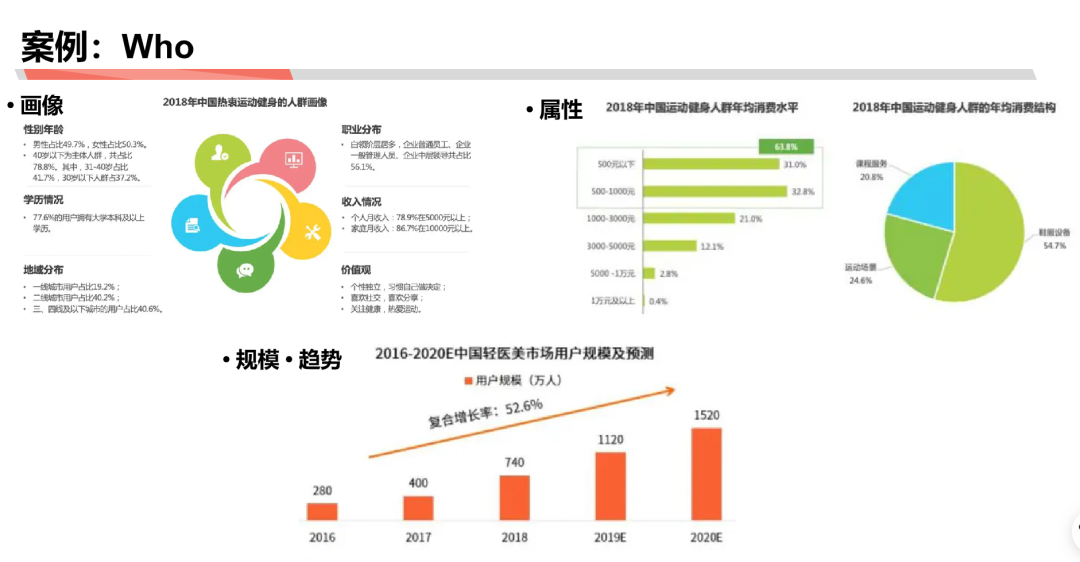 Who:我们要从调研报告中辨别出用户的画像、属性规模趋势。比如热衷运动健身人群画像:年龄性别、学历、 地域分布、职业分布、收入情况、价值观等等。也可通过分析热衷运动健身人的人均消费水平、年均消费结构等 进一步分析这类人的属性。规模趋势:例如医美市场用户规模以及预测。