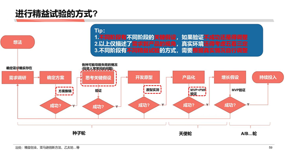 然后,原型的话还需要进行原型原则,如果说你不会就先打个样板,你可以先去做简单的demo, 去找用户去做原型实测。去现场去推销,看一下用户的接受情况。如果他失败了,就重新回来;如果他成功了,就开始思考产品化。产品化之后,一样经历MVP+PMF来逐步验证。失败了,就打回去;成功了就再往前走。
