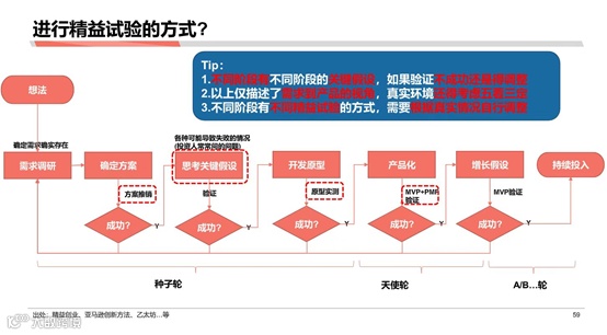 之后,才会投入钱去做增长和营销。再验证增长与营销的假设,如果失败了再回去,如果成功了,再往前,再次去投入。整个的过程大概是这么个样子。你如果对上文字的话, 其实就是种子轮到天使轮到ABC论。