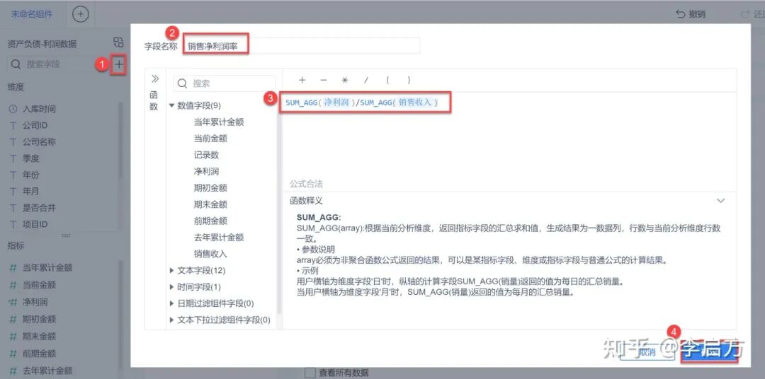 添加「计算字段」,命名为「销售净利率」,输入公式:SUM_AGG(净利润)/SUM_AGG(销售收入),点击「确定」