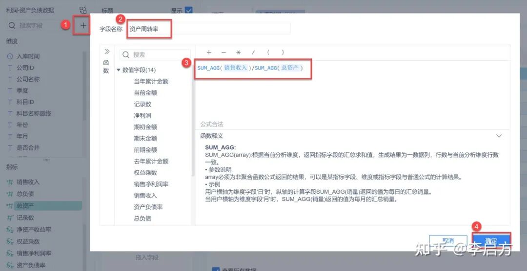 接下来,计算资产周转率,再次添加计算字段,命名并输入公式:SUM_AGG(销售收入)/SUM_AGG(总资产),点击「确定」