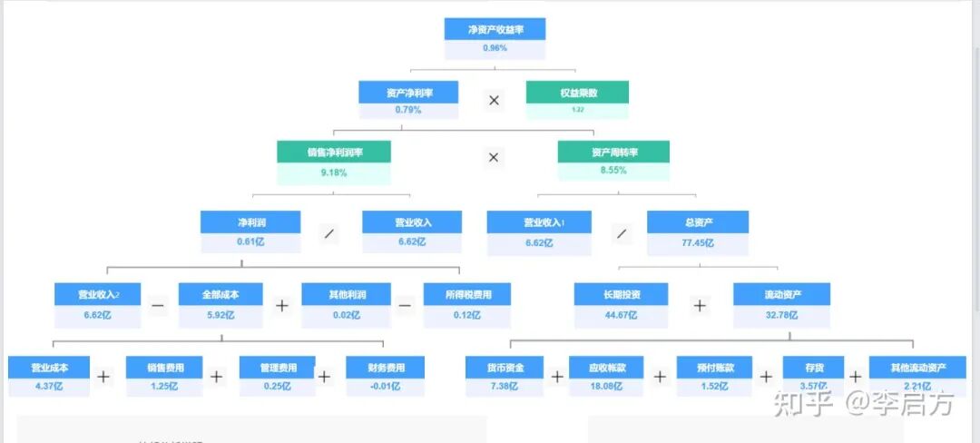 总的来说,杜邦分析法其实就是以ROE为核心,自上而下拆分的一个金字塔结构: