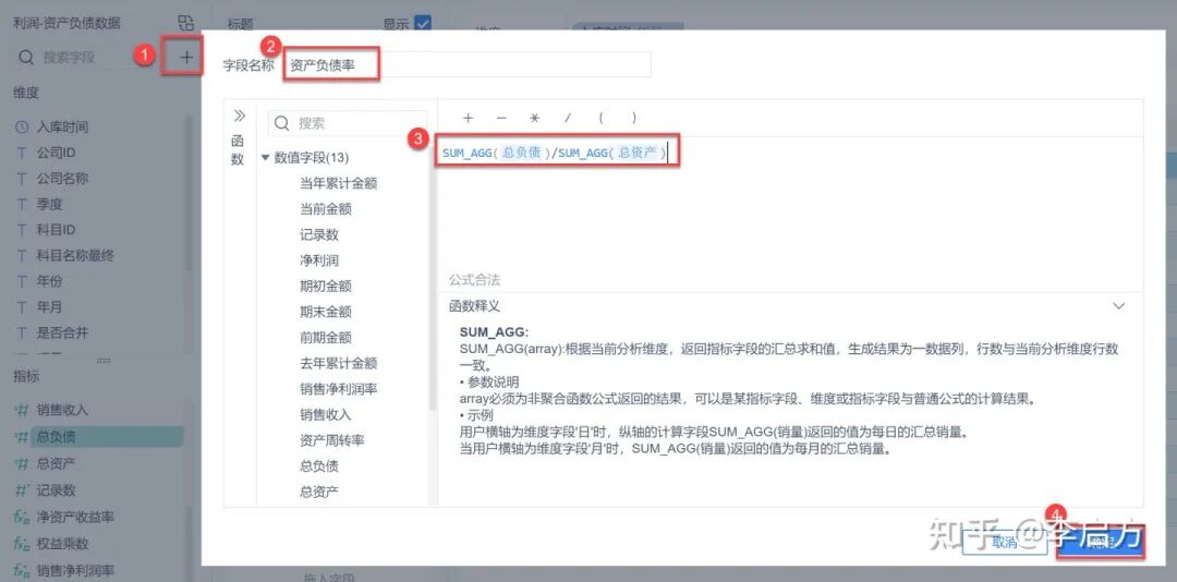 再接着计算权益乘数,再次添加计算字段,命名并输入公式:SUM_AGG(总负债)/SUM_AGG(总资产),点击「确定」