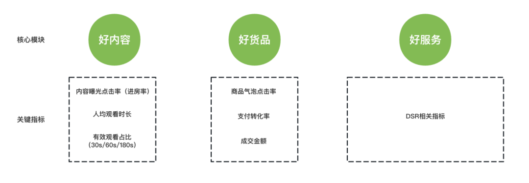 核心指标:商品气泡点击率(用户对商品的兴趣程度),支付转化率(用户观看后能否发生购买), 直播间开播期间窗口期成交金额