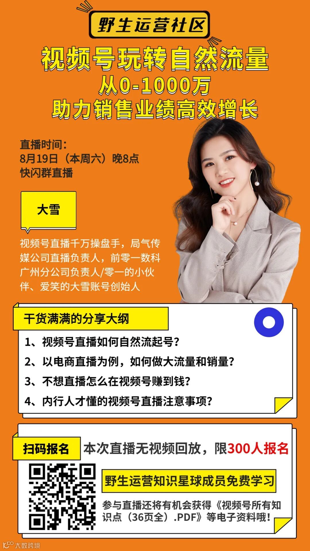 本周六晚8点,我邀请了大雪,视频号直播千万操盘手,前零一数科广州分公司负责人带来分享《视频号玩转自然流量:从0-1000万,助力销售业绩高效增长》。本次分享不设视频回放,限量场观 300 人,想报名的小伙伴先上车😎参与直播,还有机会获得《视频号所有知识点(36页全).PDF》哦!