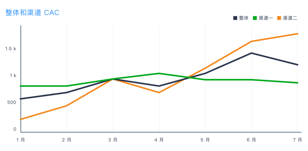 例如,一个月中在销售和营销上花费了 50,000 元,并获得了 50 个新客户,则该月的客户获取成本 CAC=50,000/50=1,000 元。