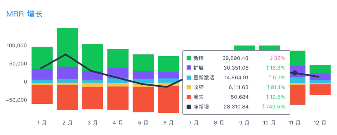 例如,当月产生了 1,000 元的新 MRR,又产生了 1,000 元的向上销售收入,但由于客户流失而损失了 500 元 MRR,那么我们的净 MRR=1,000+1,000-500=1,500 元。