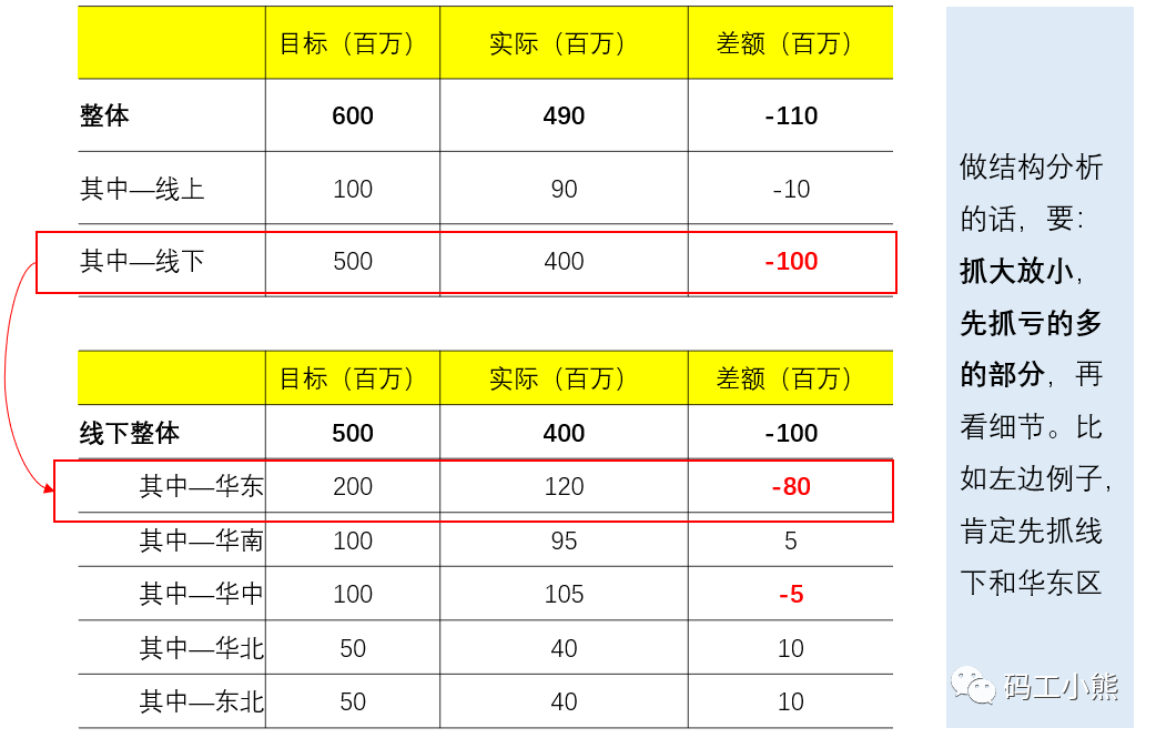 举个简单例子,一个公司有线上/线下两大销售渠道,整体销售业绩如下图所示。在业绩不达标的时候,应该先看:线上/线下,哪个是不达标主要原因。如果发现线下是主要原因,就再看线下的结构,线下一共有5大大区,进一步看(如下图)。