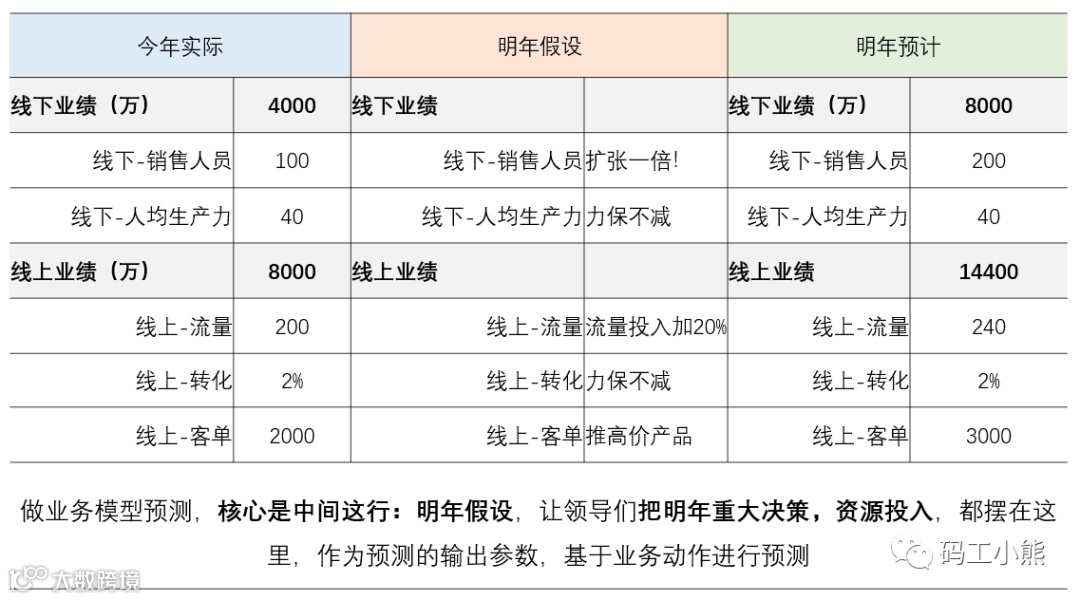 因此,在预计明年目标的时候,不推荐用算法模型(都不准!),而是推荐用业务模型预测,把所有假设条件写下来,再做推演(如下图)。