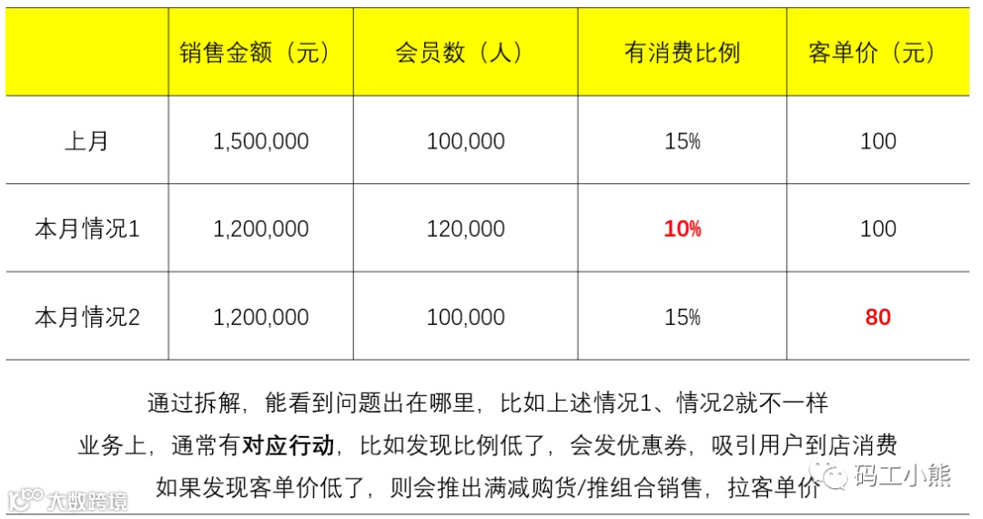 指标拆解法,一般用于线下销售。比如将门店业绩拆分为:客户数*消费率*客单价,之后可以看到:到底是因为来消费的客人少了,还是客户消费力下降了(如下图)。