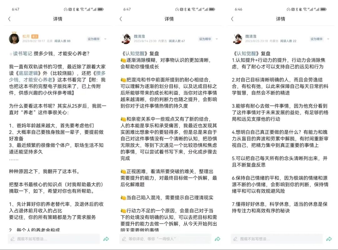 先独立写读书笔记,然后再在社群/星球里随机阅读一篇笔记,记下对你有启发的点,然后在群里cue那个人,说出你的赞同的想法。同时,多看别人的观点,可以丰富自己的价值主张。
