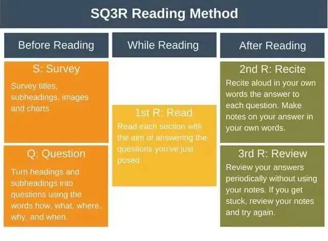 SQ3R阅读法五个步骤的首字母缩写:浏览(Survey)、提问(Question)、阅读(Read)、回想(Recall)、复习(Review)