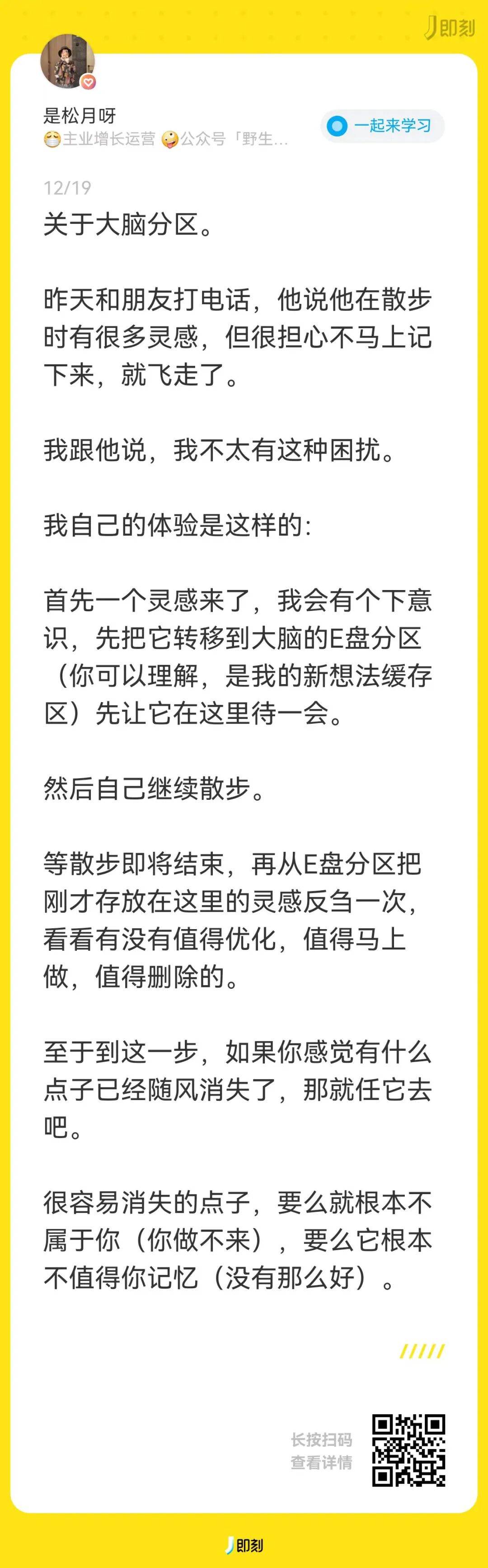 直到这两年,我才发现我在工作、生活、思考、学习上的系统好像有一点点建立起来了,比如关于自己大脑分区(特指灵感)的建立和调取,我能做到灵活自如,同理在处理情绪,处理事情,我也有不同的脑区和思维方式可以调用。