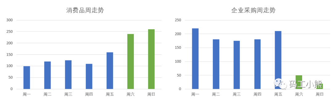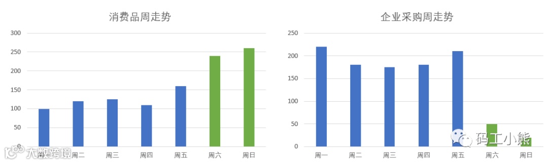 3、周/月波动。有的商品每个季节都有,是人们固定需要的,但是消费者并非每时每刻都会来采购,因此会产生周/月波动。比如快消品一般周末卖得好,人们放假了才有空买东西。toB类采购,则是工作日卖得好,周末没人加班搞采购流程(如下图)。