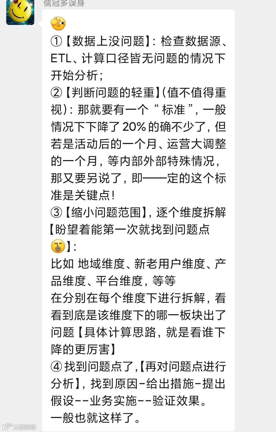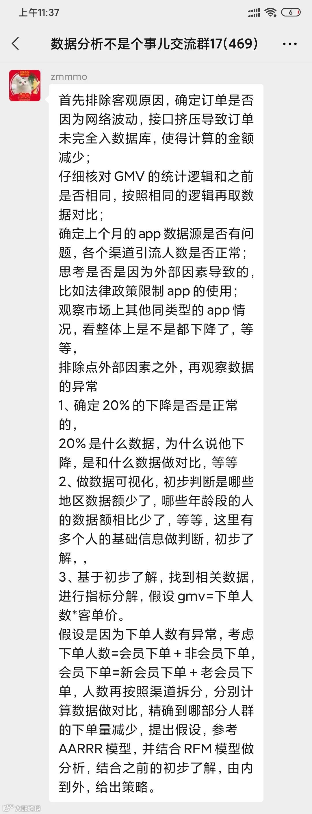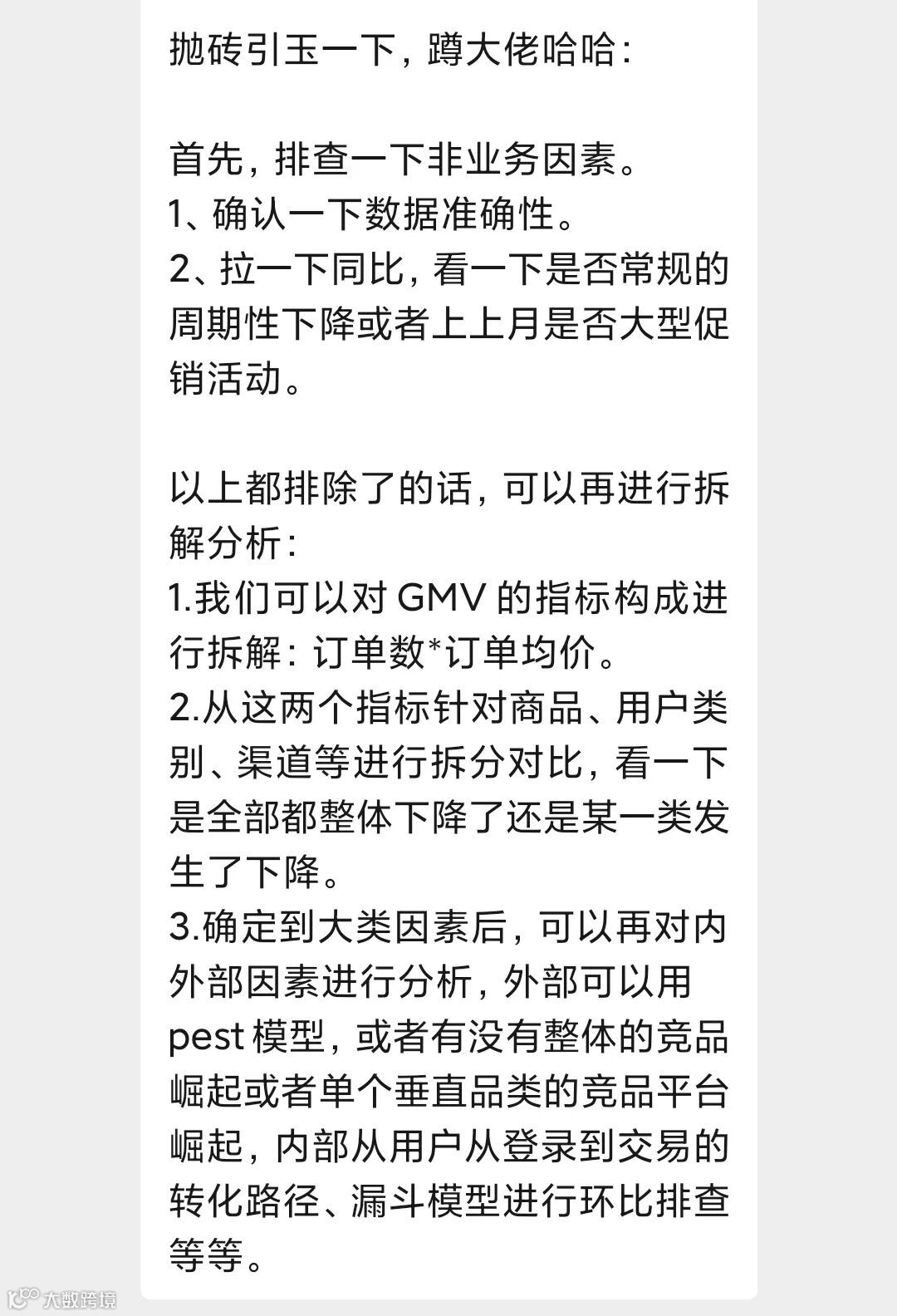 这类题型是数据分析笔面试中的一道非常经典的面试题,它考察的不是你具体要分析哪些指标,而是你面对问题时的一个分析框架与思考逻辑,这是一位优秀数据分析师最基本的能力。