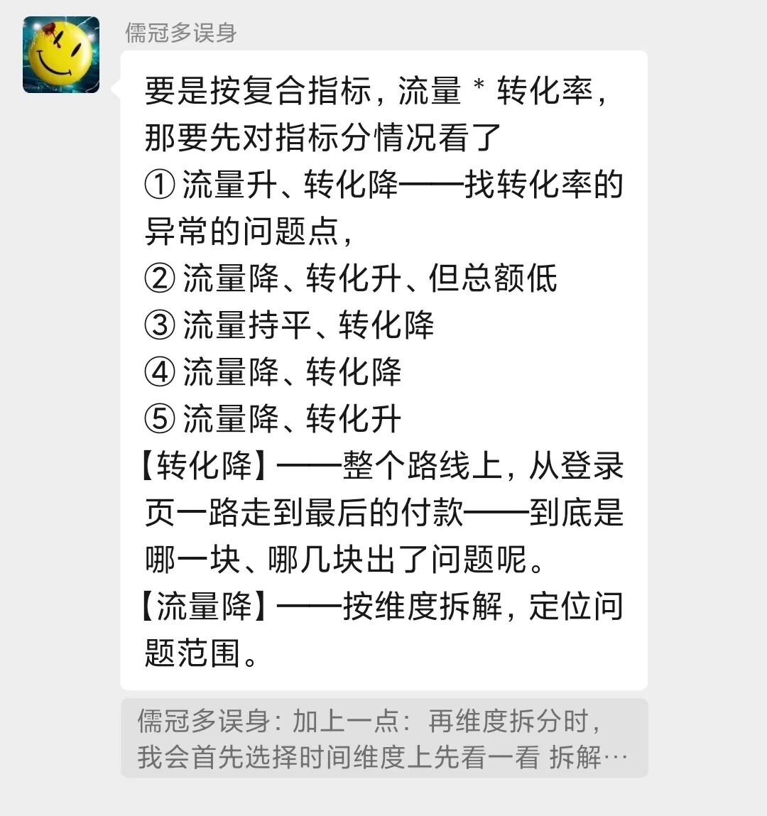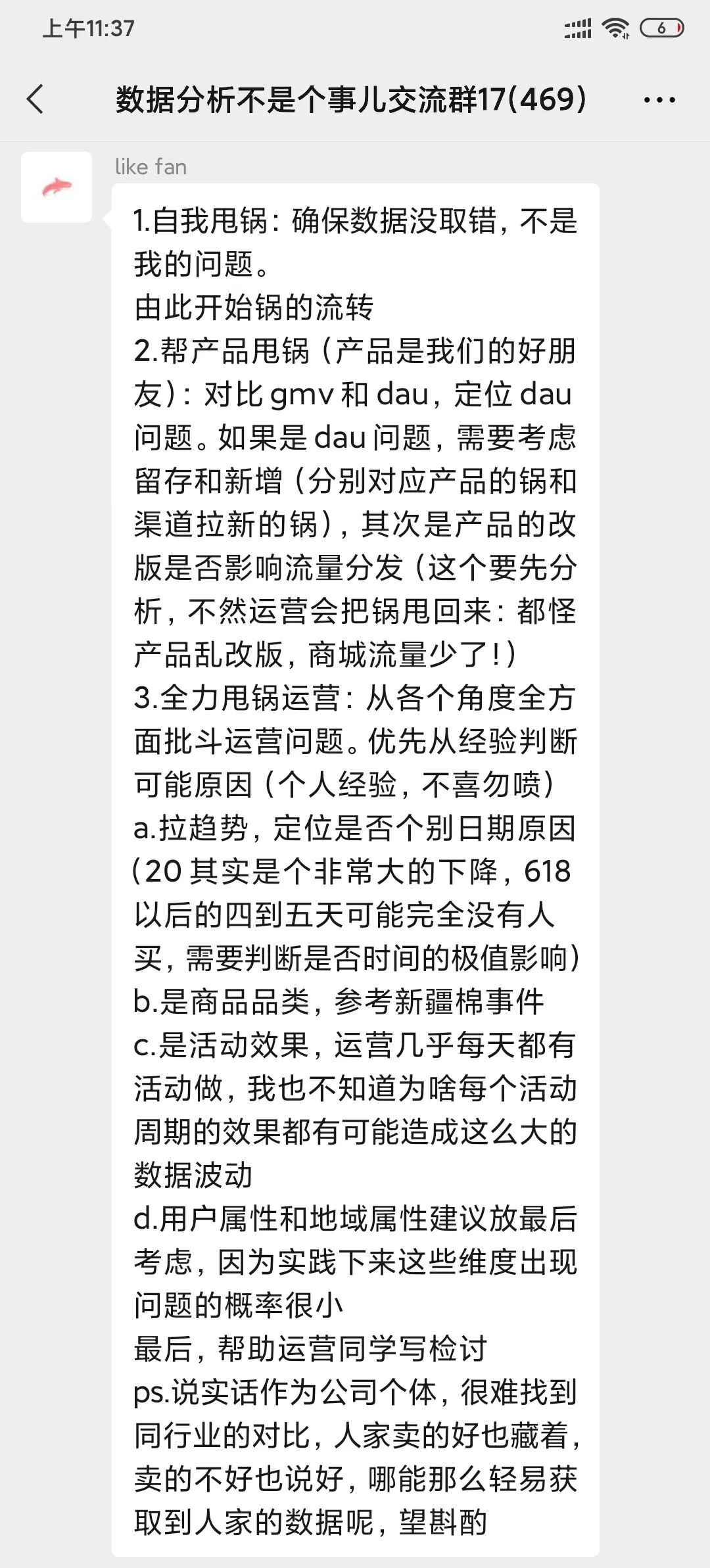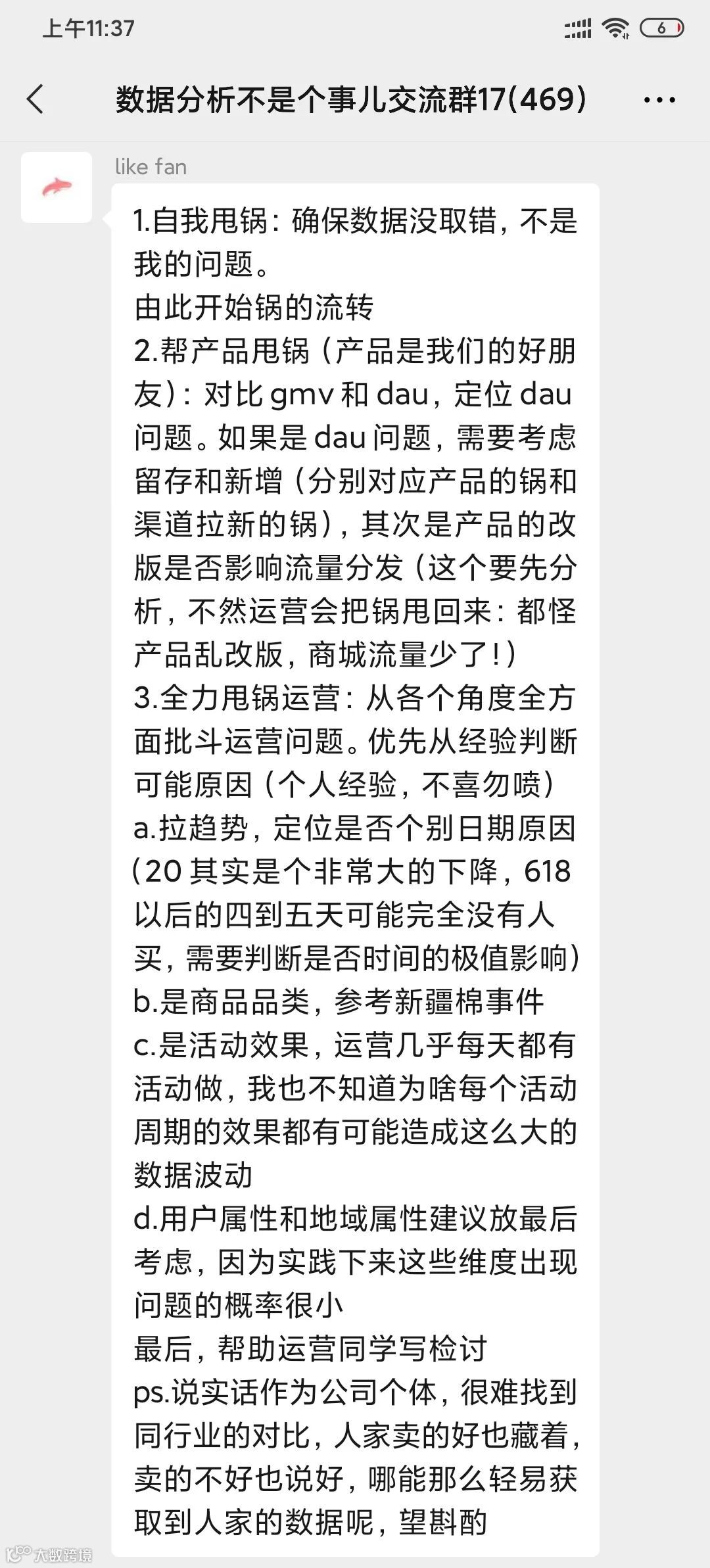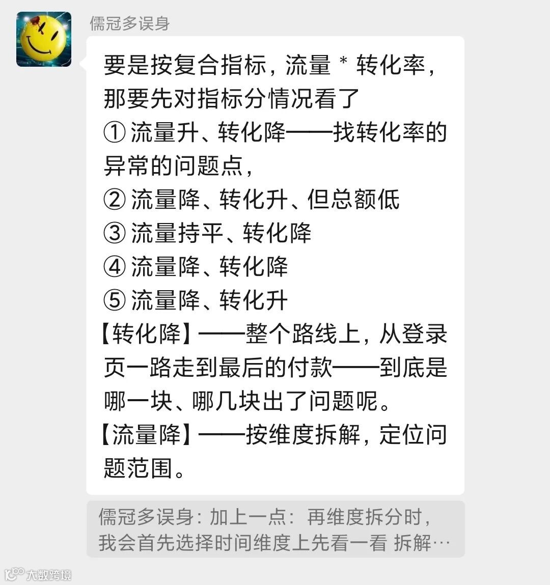 这类题型是数据分析笔面试中的一道非常经典的面试题,它考察的不是你具体要分析哪些指标,而是你面对问题时的一个分析框架与思考逻辑,这是一位优秀数据分析师最基本的能力。