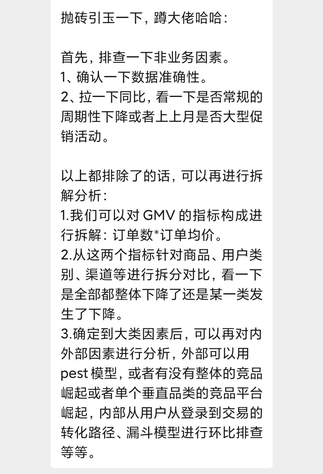 某电商APP上个月的GMV(成交总额)下降了20%,请你分析一下情况和原因。