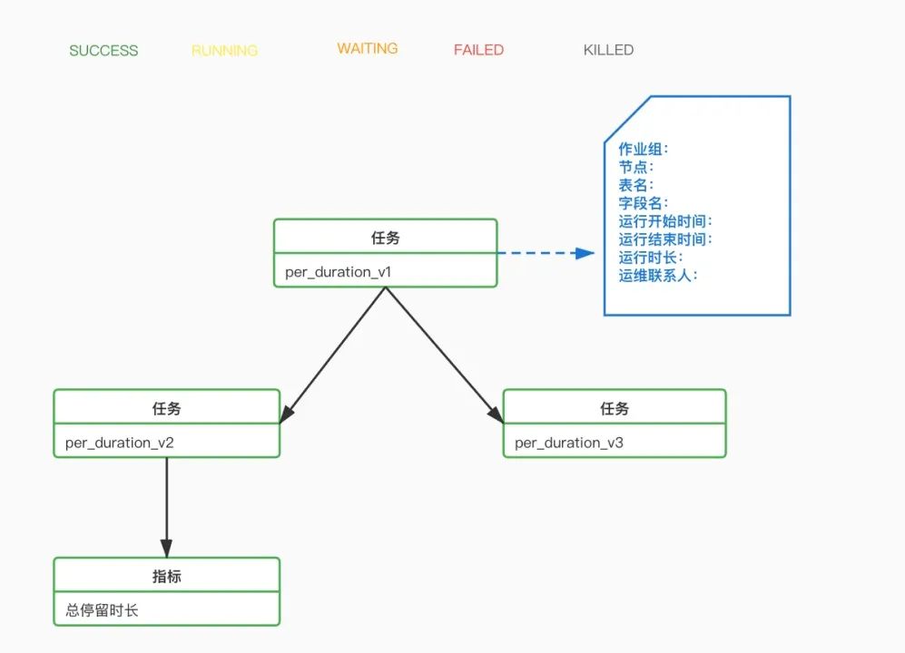 此时我们查看血脉图可以看到总停留时长这个指标是执行成功状态,且依赖的作业也是执行成功的状态,而我们要排查的人均停留时长指标是总停留时长指标的派生指标,这样我们可以得出结论并非是调度任务出现问题,接下来可以排查是否是运行指标的任务出了问题。