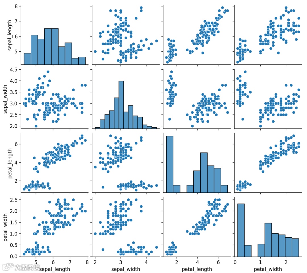 相关性可视化为散点图,对角线用直方图或密度图表示每个变量的分布。