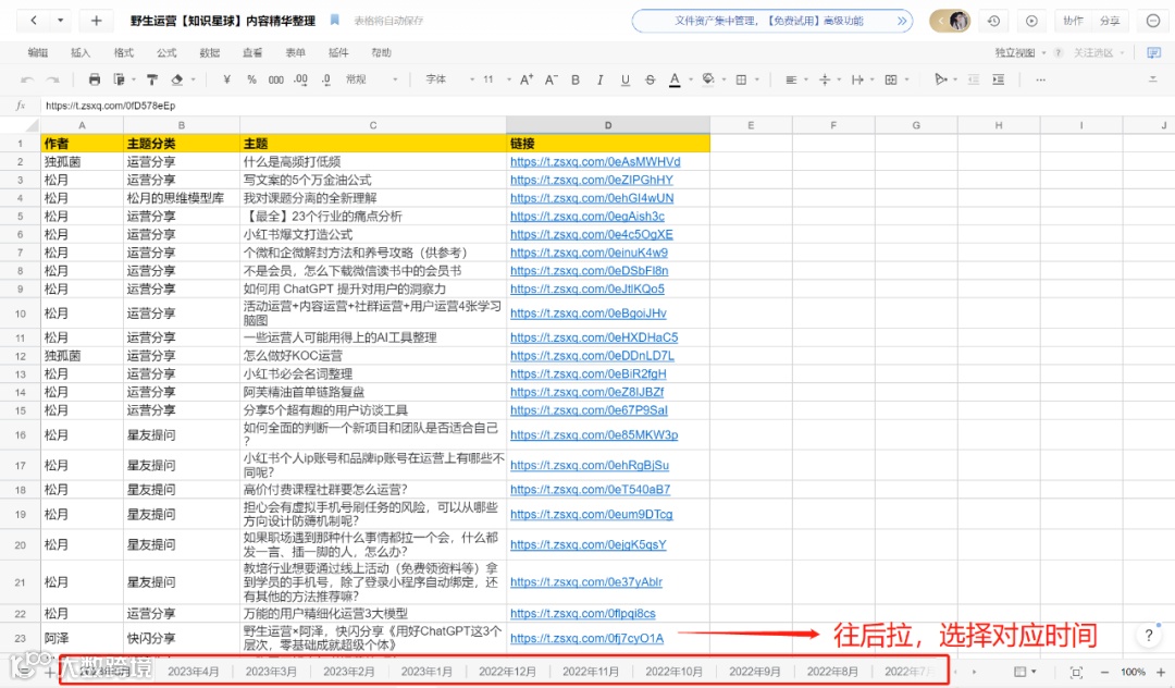 看到这里,你会不会觉得内容如汪洋大海,是的!但也不是,这里有精华有整理,不会让你迷失。因为知识星球里的搜索不太好用,每个月的精华帖整理出来了,加入星球和老朋友续费,私信松月就可获得,下方可以按照时间轴拖拉,快闪分享+读书会等主题栏目在石墨的最后端,别错过啦:
