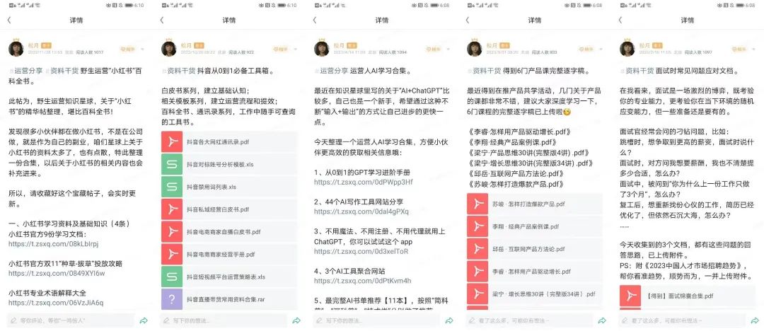 根据大家的实际工作痛点难点,上传了有针对性的学习资料,如小红书、视频号、数据分析、社群运营、企业微信裂变、裂变海报库、副业进阶等,目前该主题下已有 2500+ 条帖子。
