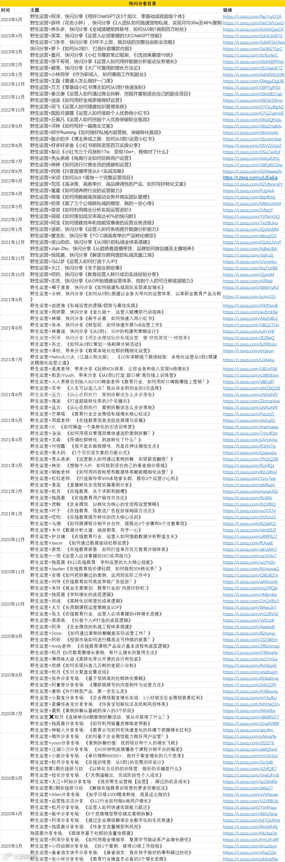 围绕运营岗、个人精进、时下热点等,主理人会邀请该领域的实操人,目前已经开展全域、AI运营、小红书等170+场快分享,会员每场都可回看。