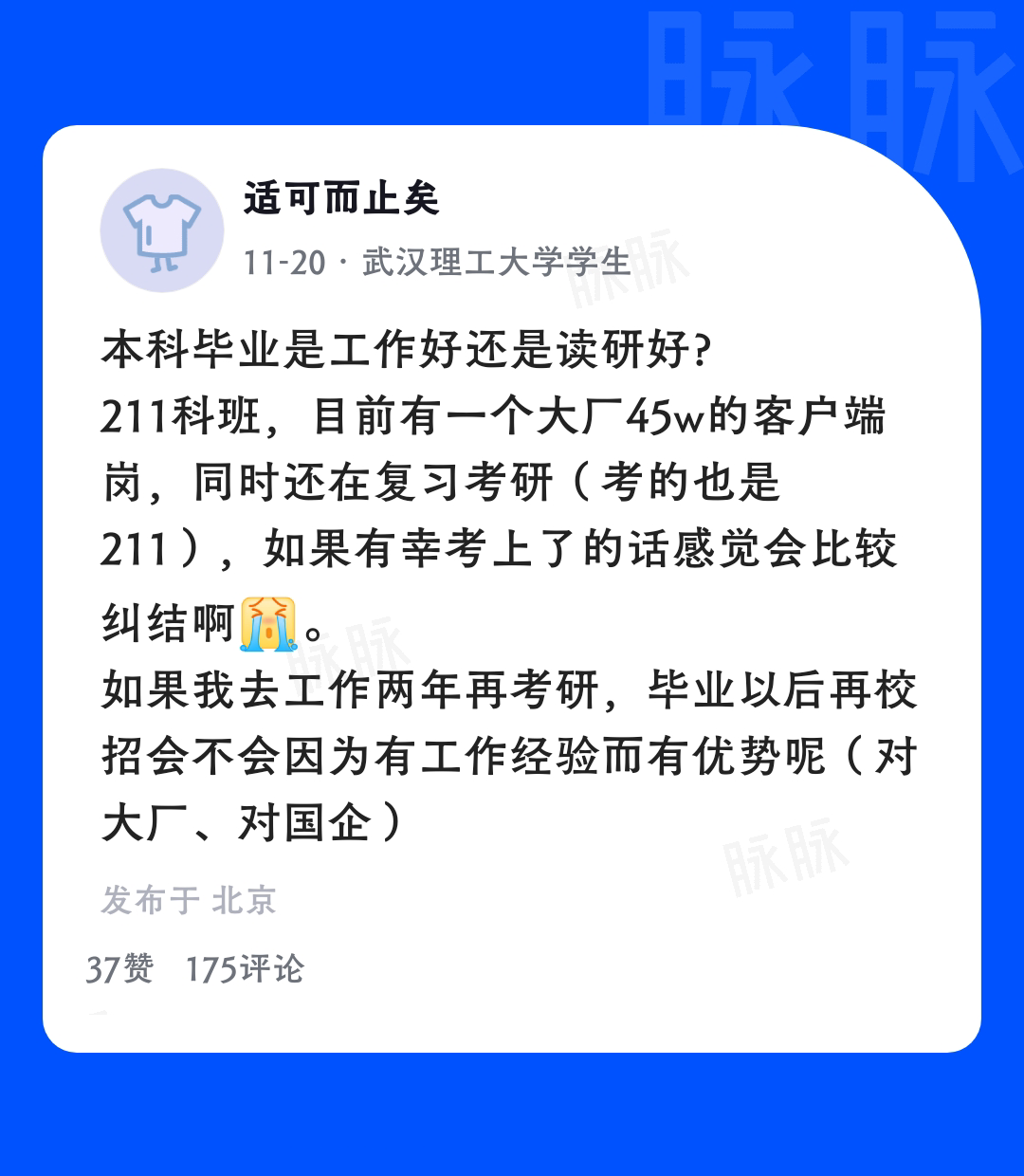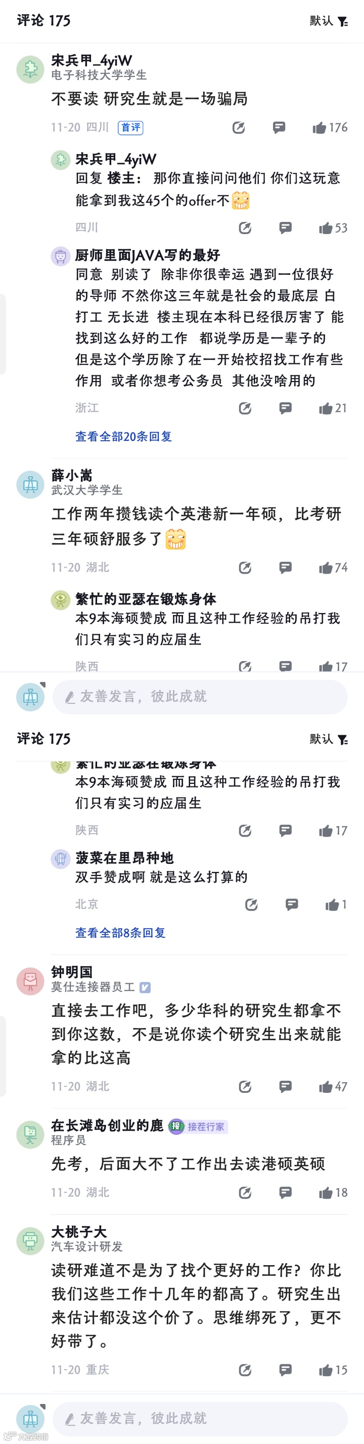 211科班,目前有一个大厂45w的客户端岗,同时还在复习考研(考的也是211),如果有幸考上了的话感觉会比较纠结啊[流泪]。