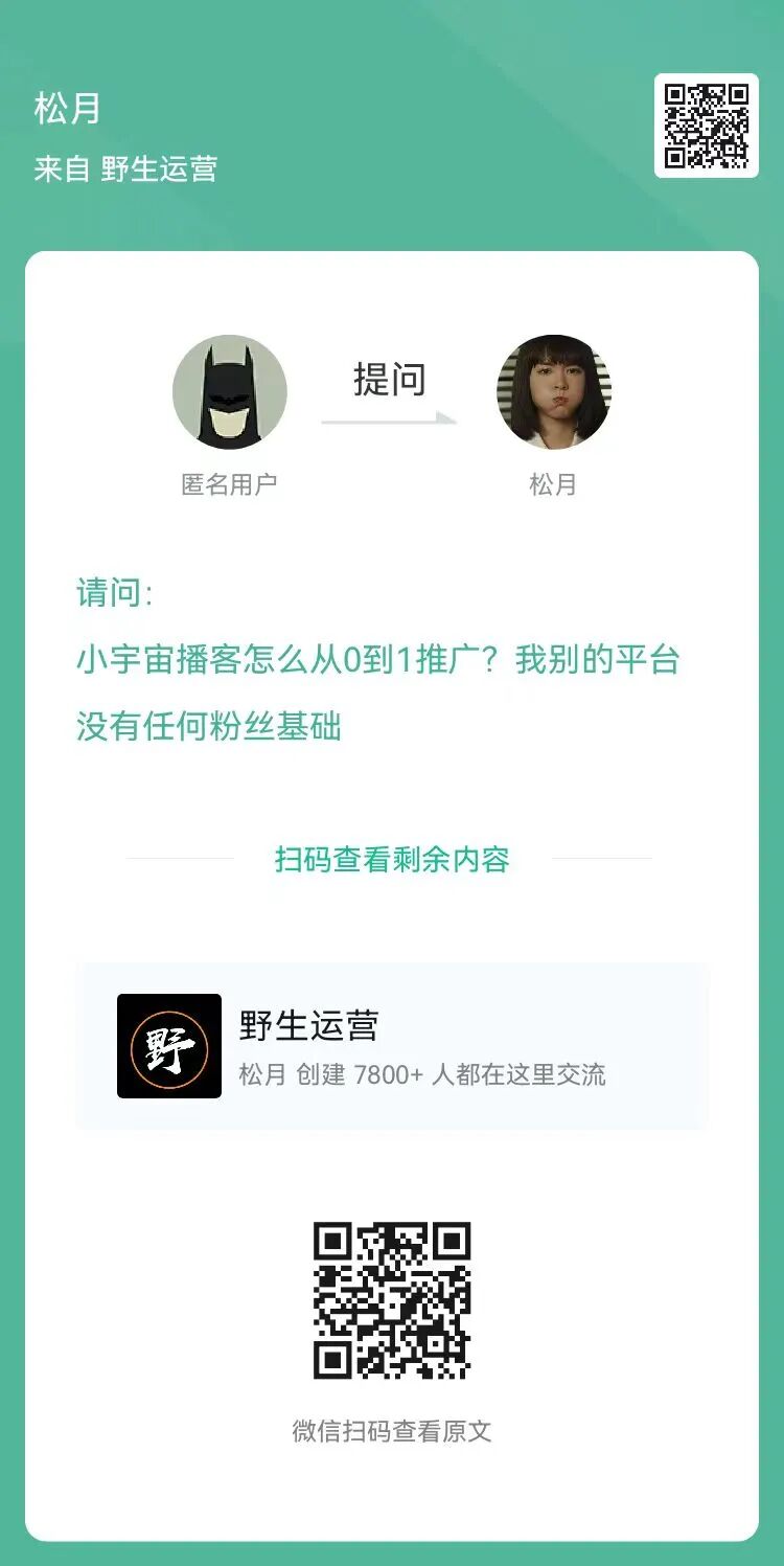 5、提问:小宇宙播客怎么从0到1推广?我别的平台没有任何粉丝基础?(扫码查看全文)