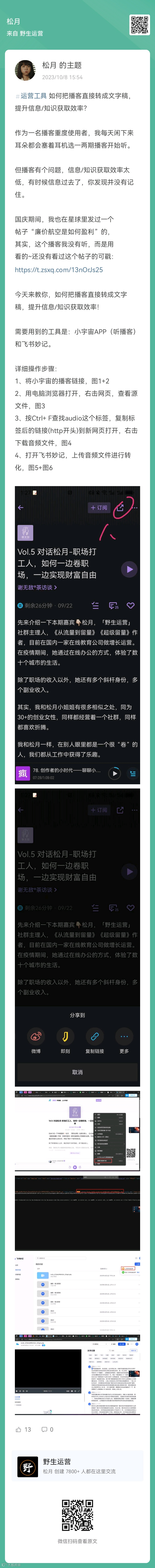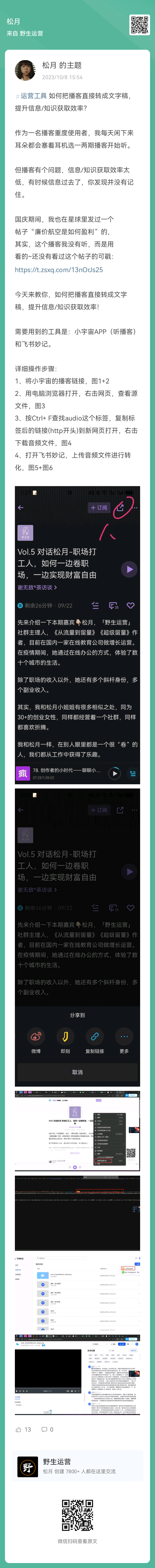 1、松月:如何把播客直接转成文字稿,提升信息/知识获取效率(扫码查看全文)