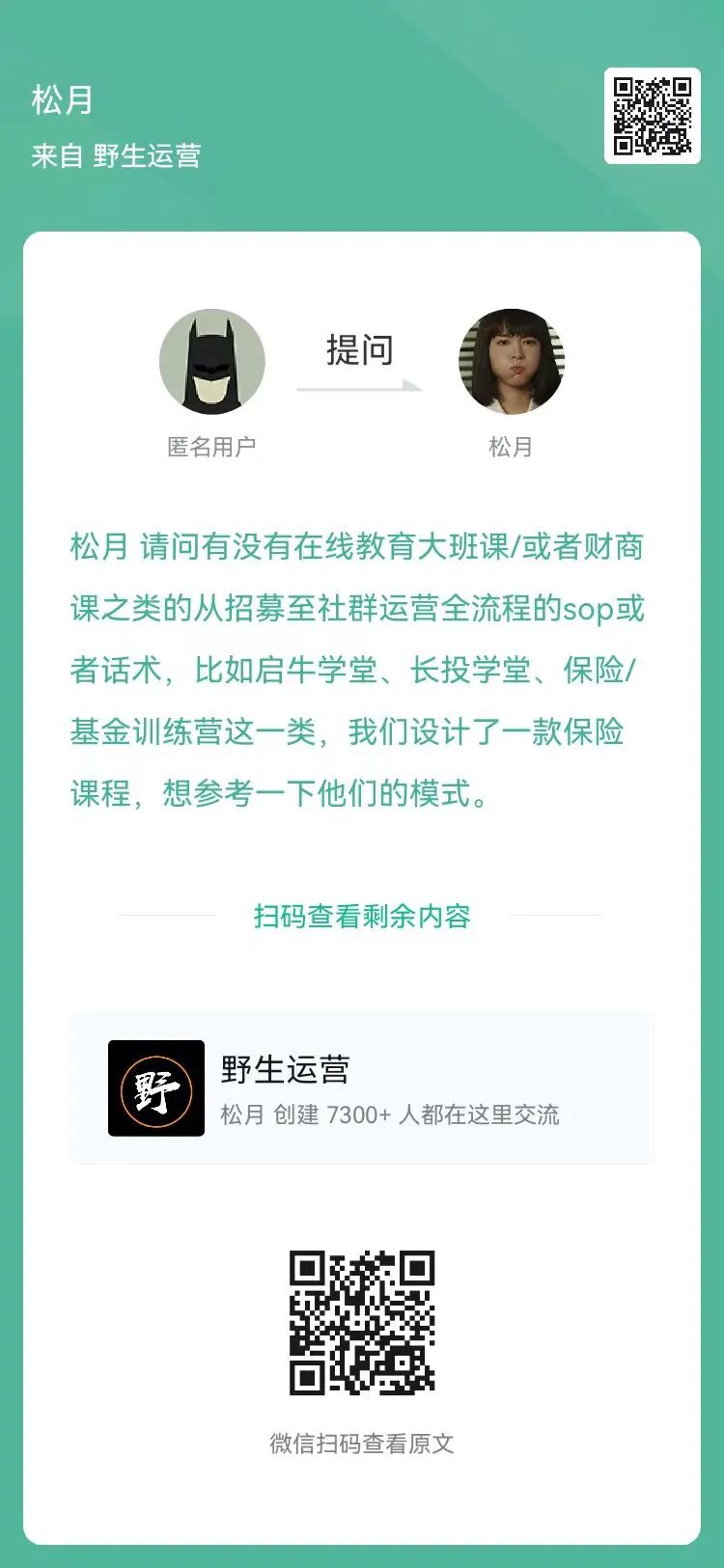 6、提问:请问有没有在线教育大班课/或者财商课之类的从招募至社群运营全流程的sop或者话术?(扫码查看全文)