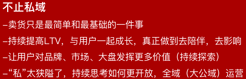 我们如果说只是把自己定位成一个在私域里面要去卖东西的,那视野会越来越窄,你会不断的去深究我要获得去从公域那边得到多少流量,一旦你的这个想法太过激进,那公域的负责人,也可能会比较反感。