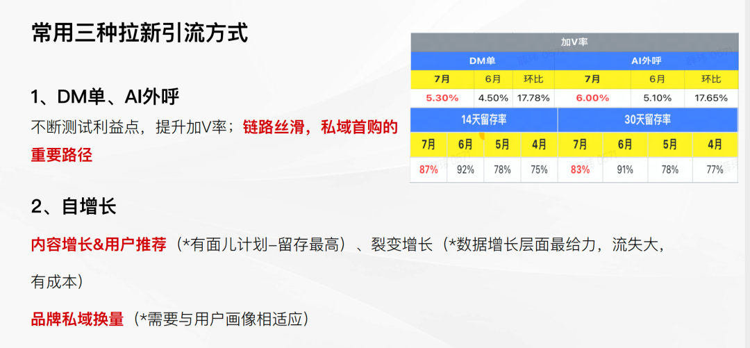 第一点,毋庸置疑肯定是新客的首购,无论是 DM 单还是 AI 外呼,它都是已经购买过的用户的召回至私域,所以这个里面一定需要持续去优化路径,让用户觉得你这里更友好、更顺畅,然后能够给他给到他一些其他的价值。