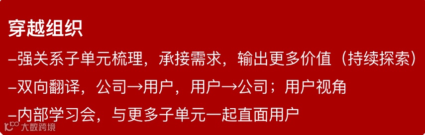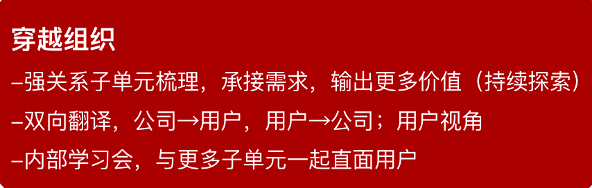 我应该再强调一个词儿,「主动」,不要等,不要做小透明!让别人看到你的价值。通过这种更主动的部门的协调,能够让别人意识到。噢,原来你做的这个事情,你承接和维系到的这些用户对我有帮助的,组织与用户能走得更近了。