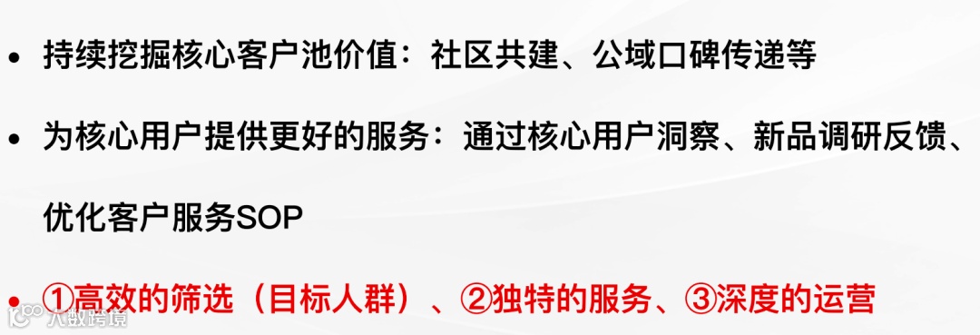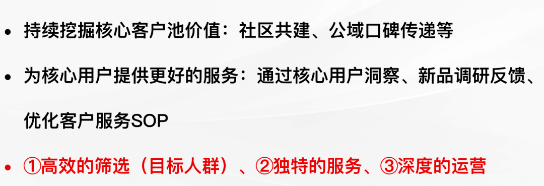 这三点的话其实就是持续的去挖掘核心用户池的价值,甚至可以从他们那边得到很多的建议,活动、产品&服务提升的建议,他们还会参与管理社群。