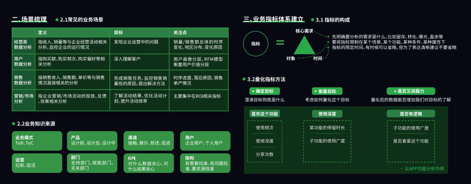 市面上的工具书都太理论,没有真正切合业务实战的内容或者参考,不能都直接拿来用,为此我特意结合60多个实际的分析场景案例,总结出一套适合快速掌握业务经验的方法论,例如数据场景梳理、数据指标体系建立等等