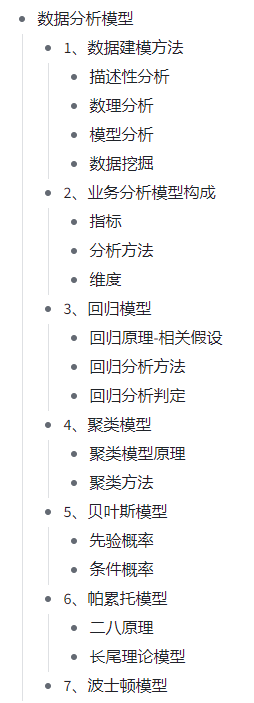 比如梳理数据分析模型模块时,不仅结合经验给出了建模的方法与构成,还详细梳理了12个常见分析模型的介绍,下面是部分知识大纲: