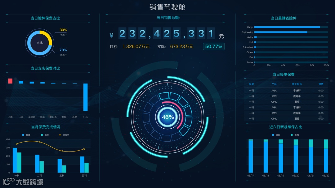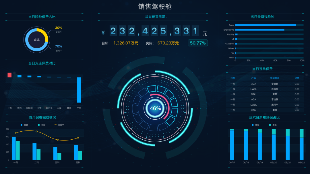 所以,围绕业绩的销售大屏对每个保险公司来说都是需要的,通过销售大屏了解每日签单情况,信息公告等,帮助管理层监控KPI执行情况,提高数据信度、效度,并激励业务部门完成KPI。