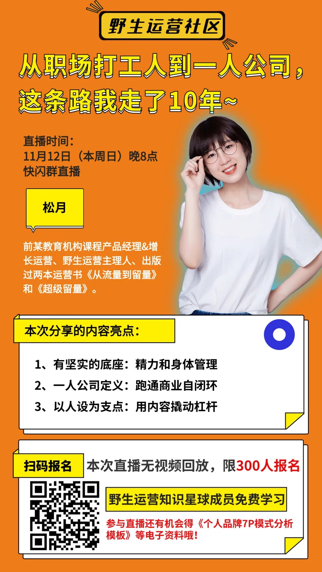 明晚(11月12日)晚8点,松月和大家在线聊聊“从职场打工人到一人公司,这条路我走了10年”其中我的一些经验总结,希望能够给你一些启发。、😎参与直播,还有机会获得《个人品牌7P模式分析模板》等电子资料哦!