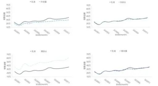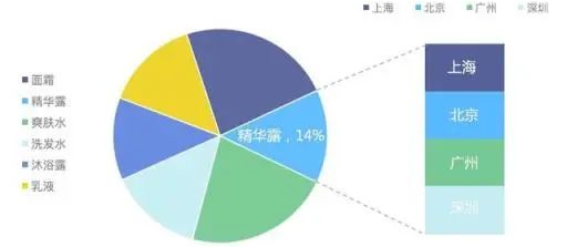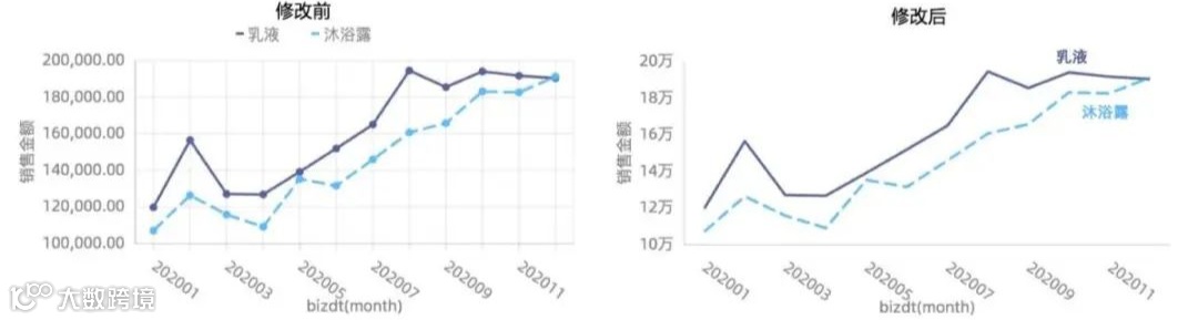 上图可以发现对于相同的数据,因为我们所需表达的主题的差异,也将呈现完全不同的展现方式。图1表达的主题是爽肤水和沐浴露两个品类在不同城市的销量排名,图2主要表达的主题是在相同城市在两个不同的品类的销量差异。