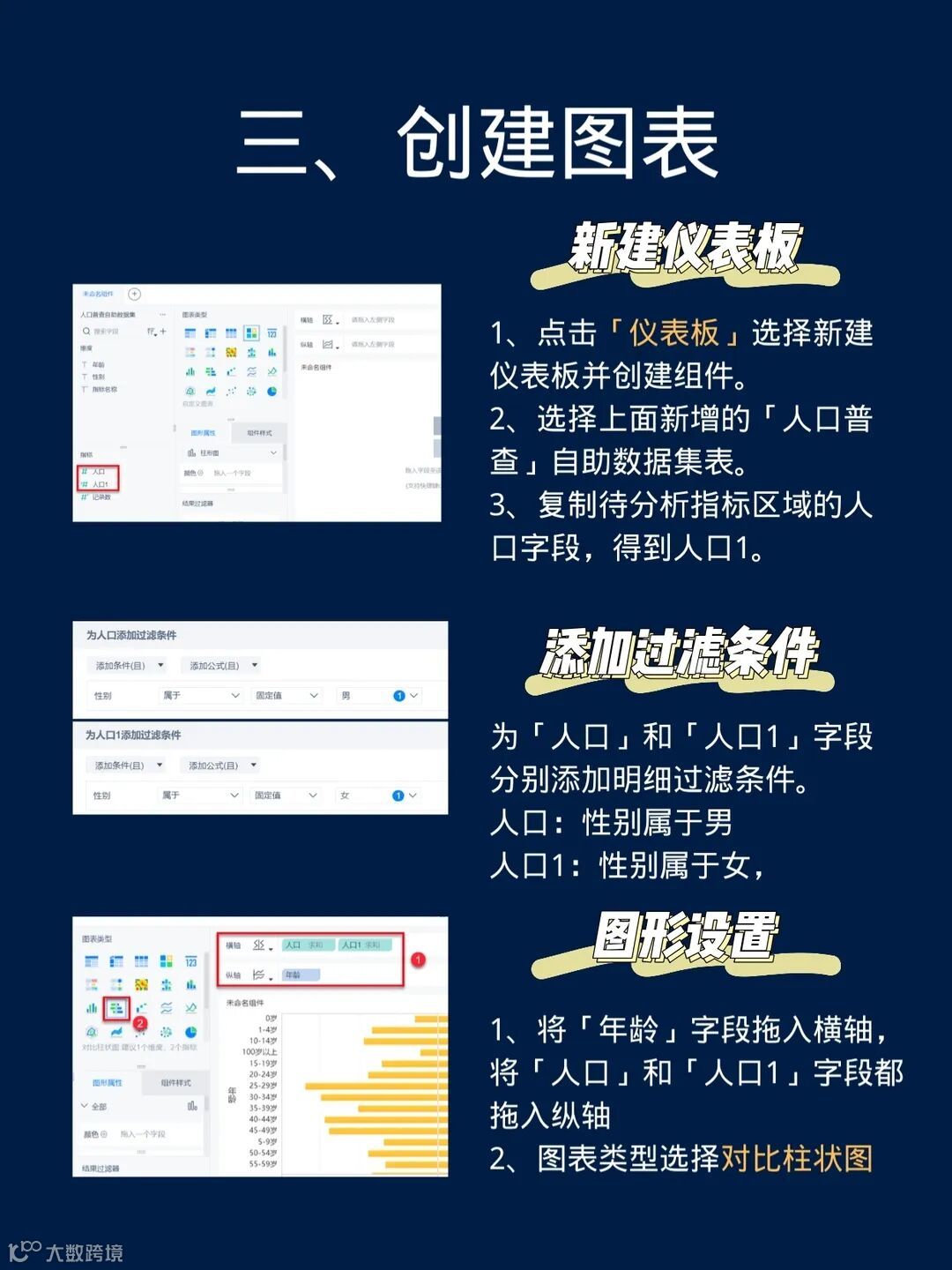 将年龄拖入横轴,将人口和人口1字段都拖入纵轴,并在图表类型处选择对比柱状图。