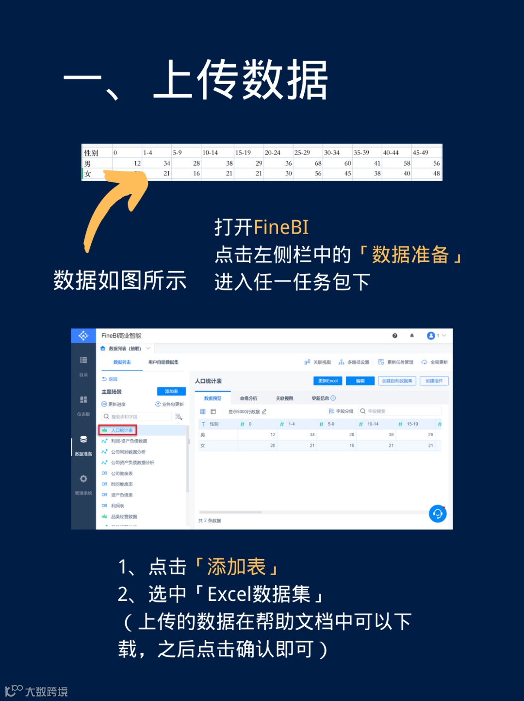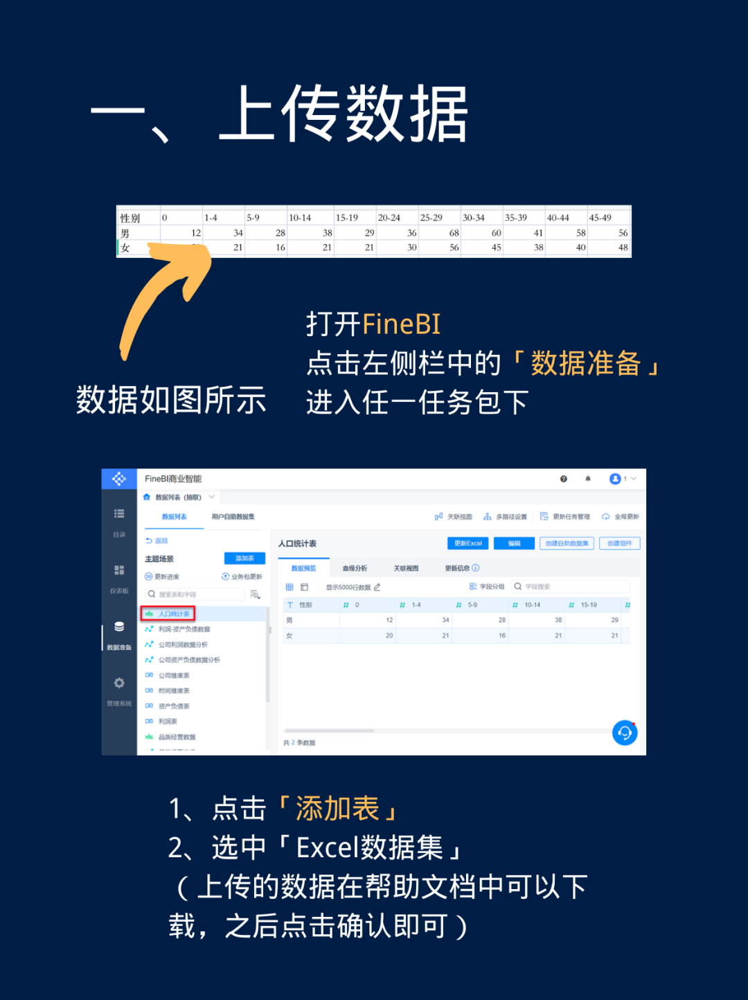 将「人口统计表」导入「数据准备」下的业务包中。这个数据在FineBI帮助文档中可以直接下载。