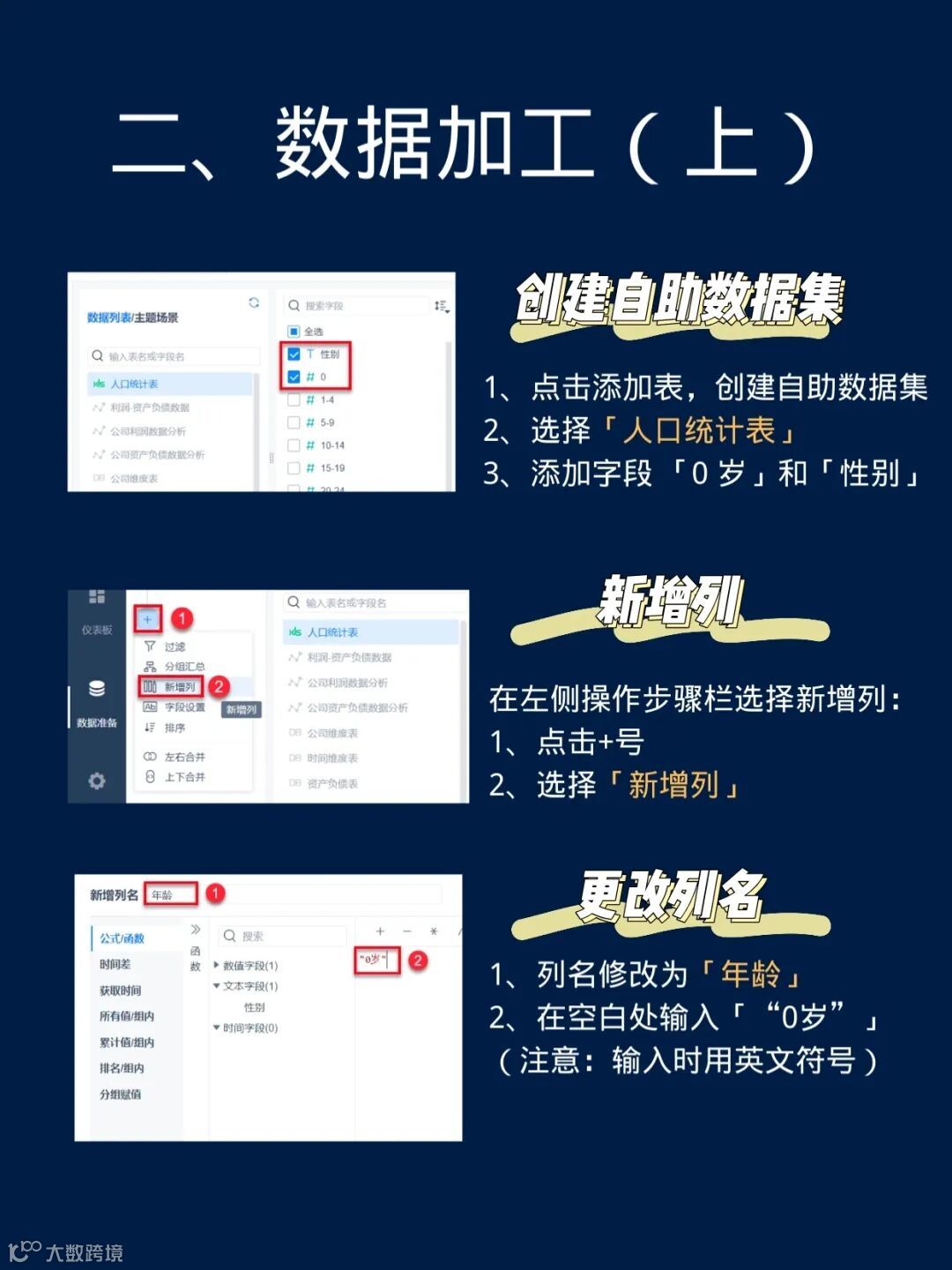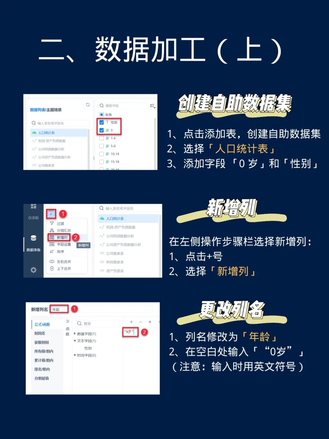 (1)创建自助数据集,添加字段 0 岁的人口数和性别;在左侧操作步骤栏选择新增列,新增一列年龄,并输入字段为”0岁”,点击确定,表名也改为“0岁”并保存该表;将之前的人口数的字段名修改为人口。