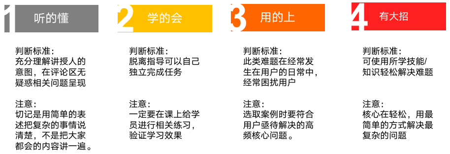 以上2个问题解决之后,会迎来我们在第几节课程卖课,卖什么课比较合适,回答这个问题的本质请回到,如何成交一个用户,逻辑如下:激发用户欲望、赢得用户信任、引导用户购买(关单)。在引导购买(关单)前,最重要的环节就是赢得用户的信任,针对在线教育的场景,用户对你的讲师资质、课程安排、课程时长、课程结构、课程理念、课程质量、课程服务、配套服务是否满意?是否足够的支撑用户做出购买的角色?