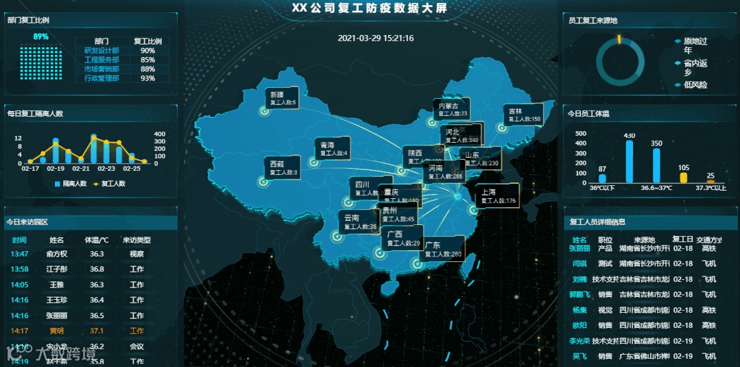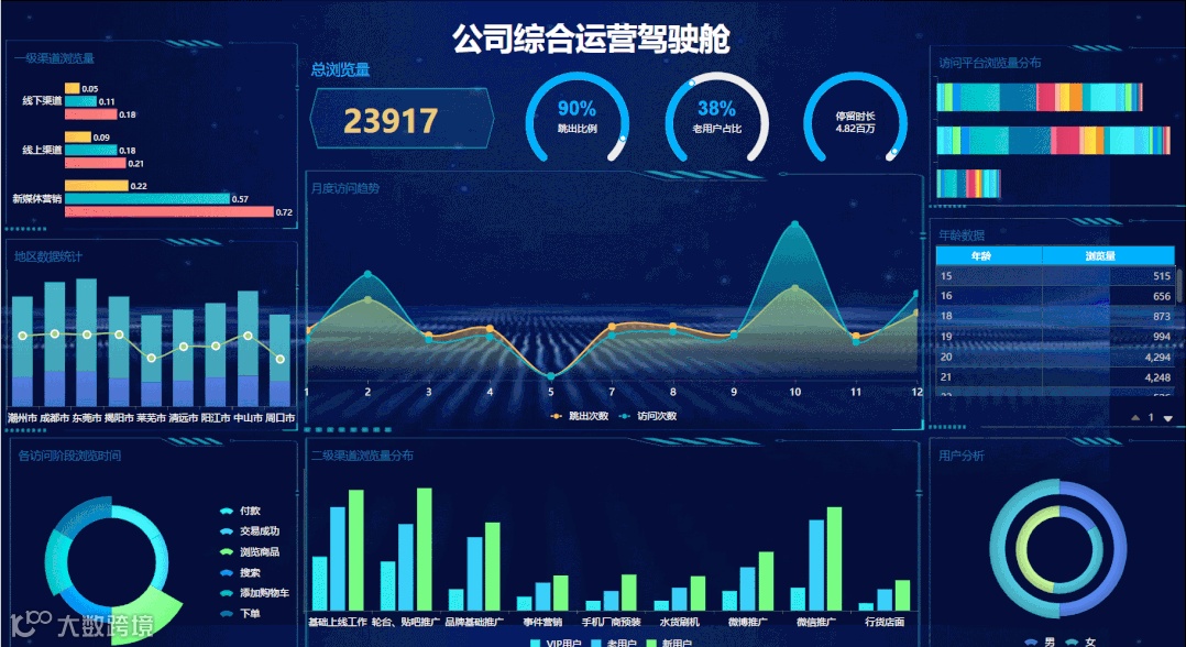 这就要回到我为什么说能。大屏更多的是核心指标的呈现和数据的实时更新,并且效果酷炫,这就使得大屏在管理层中有着天然的吸引力。试问在一堆简单图标里,如果突然出现一张这种可视化大屏,又有哪个领导不眼前一亮呢?所以在同样的数据图表化、信息化的基础上,这样的可视化效果更能让你脱颖而出。