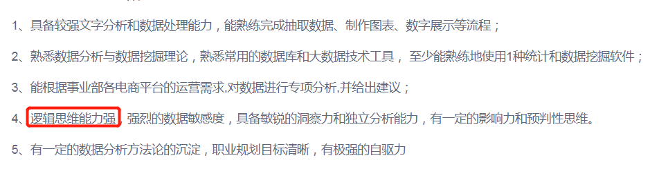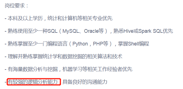 我翻阅了一些数据分析师的招聘要求,几乎所有的招聘要求中,都会有这么一条,叫做“逻辑思维能力强”。